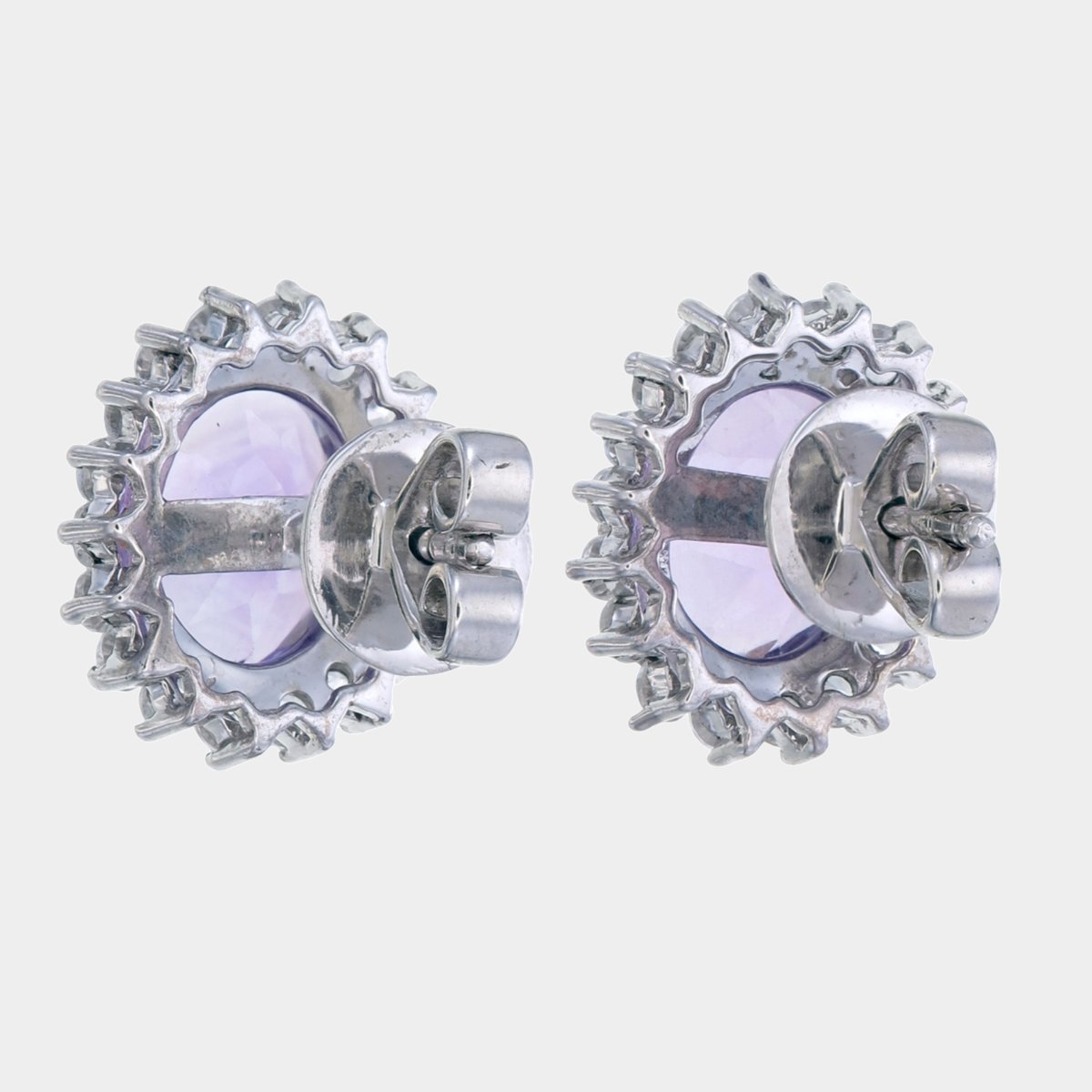 ต่างหูอเมทิสต์ขนาดประมาณ 9×7 มม. (Amethyst) ล้อมด้วยเพชรโมอีส (Moissanite Diamond)  พลอยสีม่วงสวยใส ใส่ติดหูได้ทุกโอกาส
